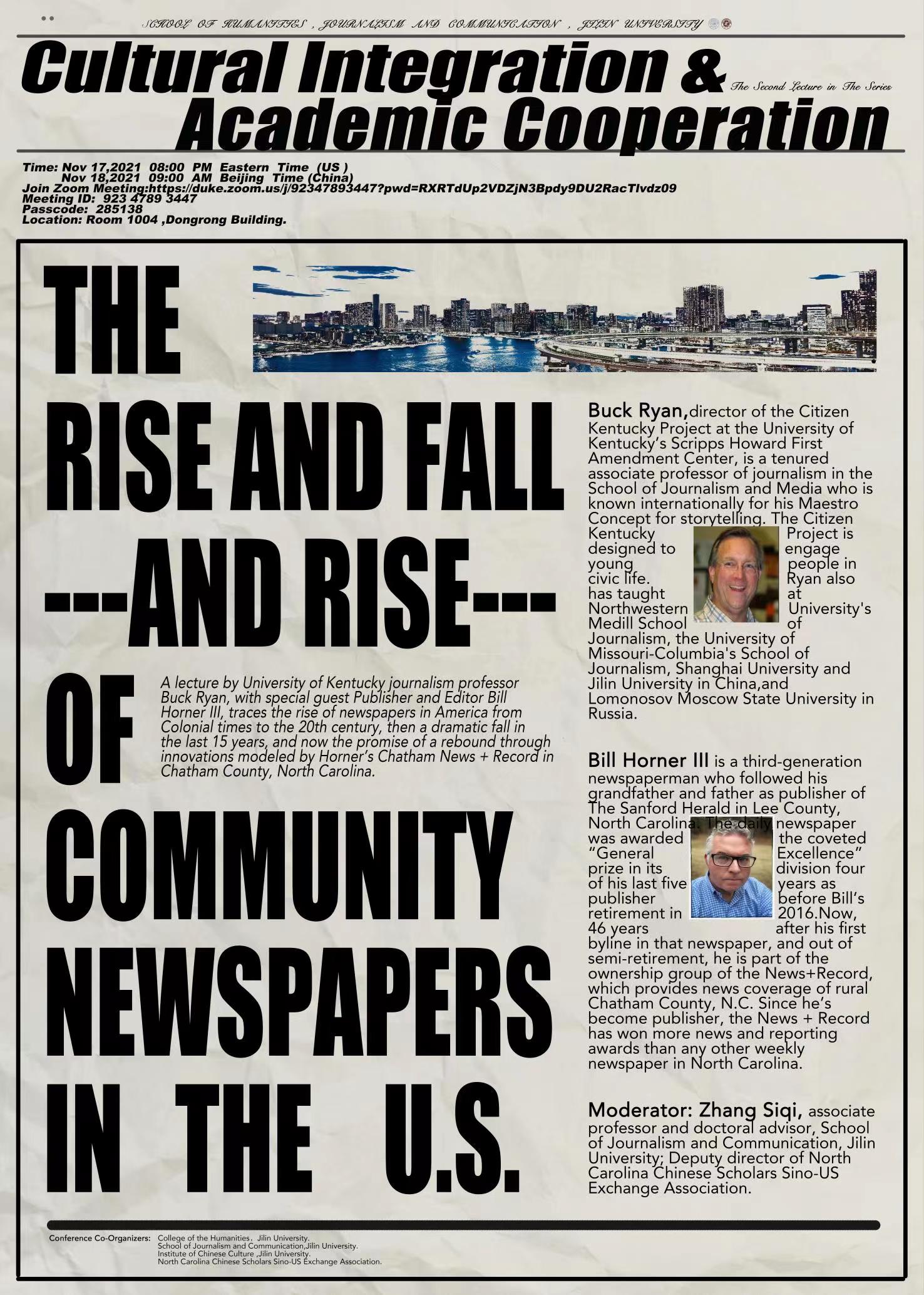主讲人简介:巴克•瑞恩教授是肯塔基大学“斯克里普斯霍华德第一修正案中心”的“肯塔基公民”项目主任,是新闻与媒体学院的副教授。他因其讲故事的“大师概念”而闻名世界。瑞安教授还曾任教于西北大学梅迪尔新闻学院、密苏里堪萨斯大学哥伦比亚新闻学院、中国的上海大学和吉林大学,以及在俄罗斯的洛莫诺索夫莫斯科大学。