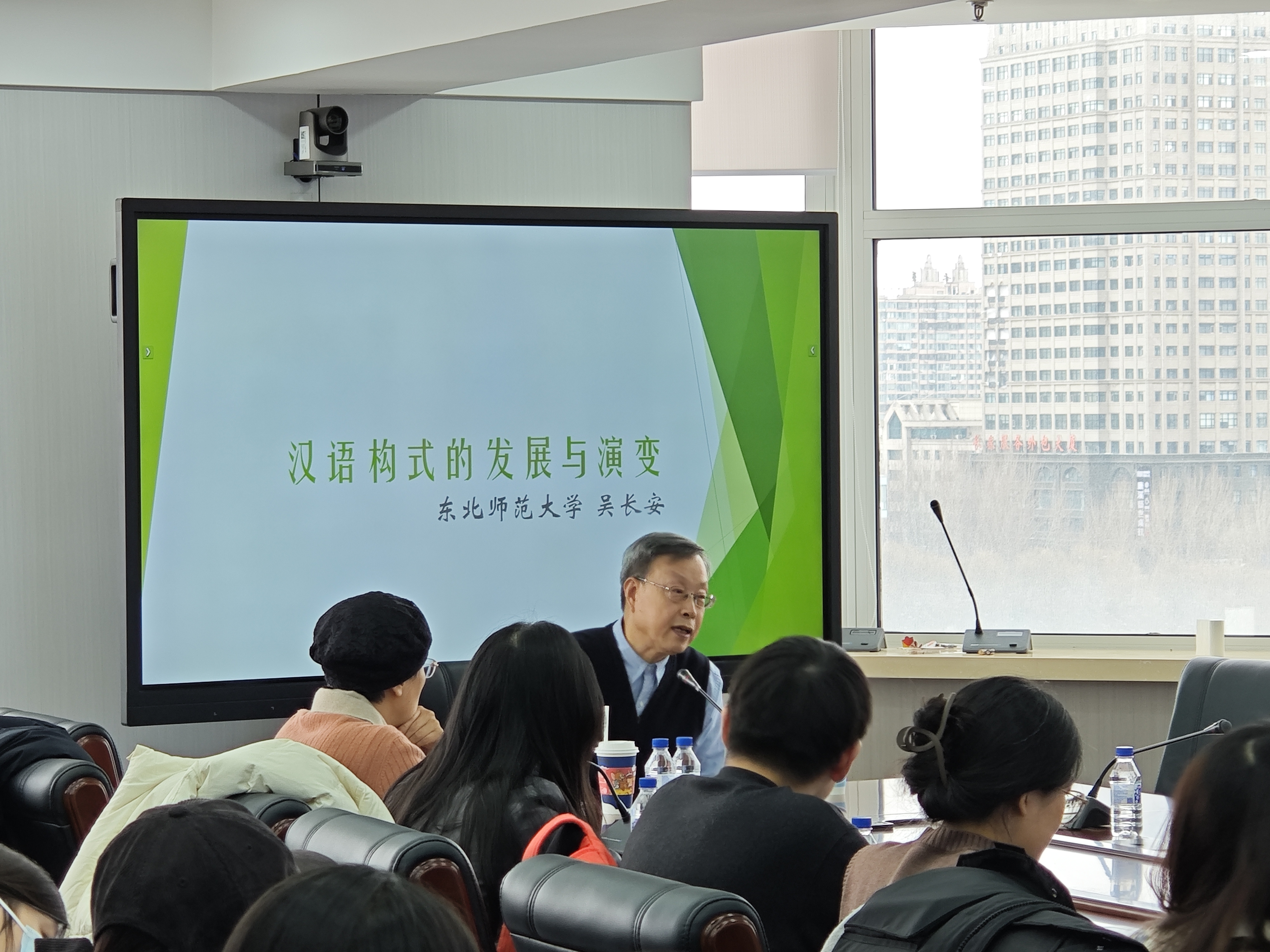 在讲座的主体部分,吴长安教授详细描摹了汉语构式从单音节时代到现今的发展路径,通过丰富的历史例证和生动的语言描述,展现了汉语构式演变的复杂性和多样性。他特别强调了“‘待’与‘嵌’”、“分析式与综合式”等多个方面,深入剖析了汉语构式发展所呈现出的独特特点,让与会师生对汉语构式的认识更加全面和深入。此外,吴教授还着重论证了汉语构式中的变异问题,通过对比分析不同语境、不同历史时期的构式变化,揭示了汉语构式演变的内在规律和动力。
