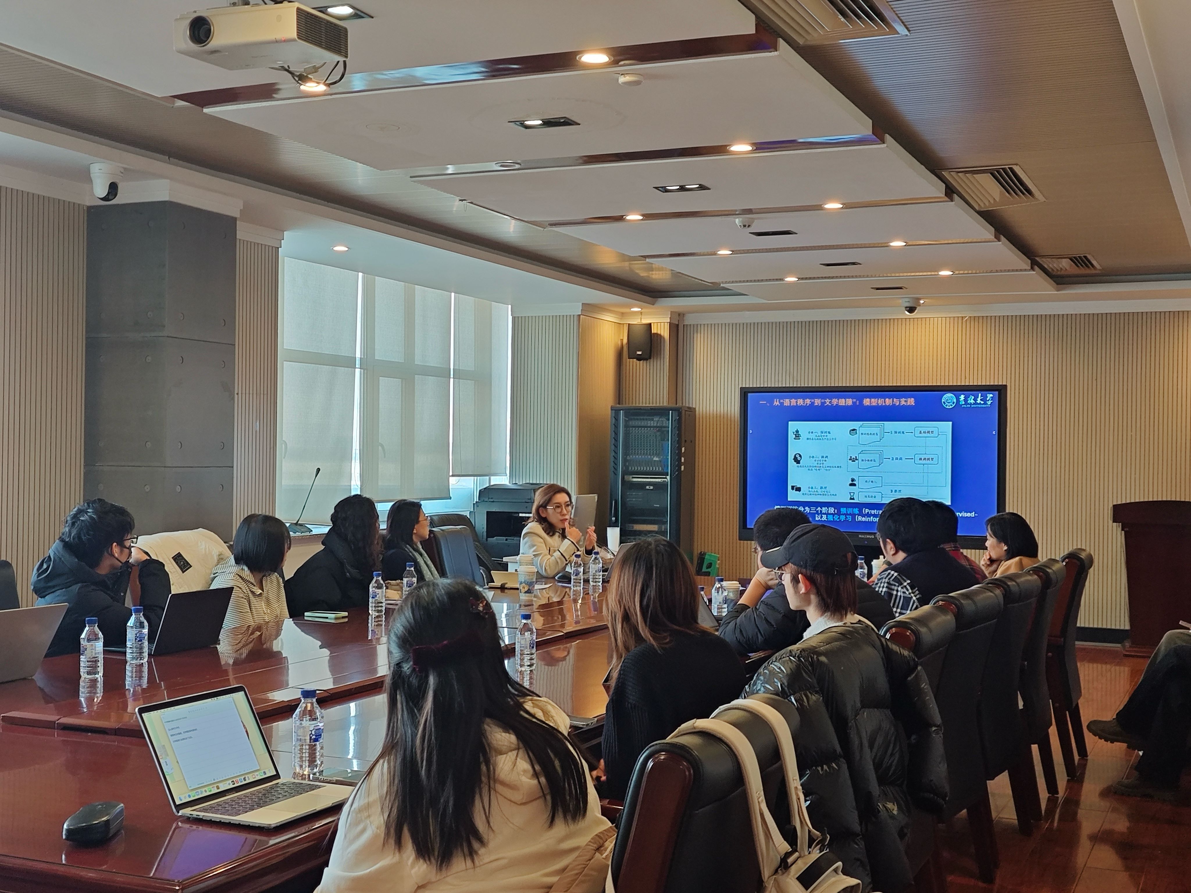 2025年11月25日下午,⽂学院暨新闻与传播学院“⽂传励新”⻘年教师学术报告会(第十场)在东荣⼤厦11楼会议室顺利举⾏。本场报告会由国际语言学院承办,国际语言学院学历教育部主任韩文淑教授主持报告会。国际语言学院院长李冬梅教授、中国现当代文学教研室张涛教授、刘帅池副教授和周鹏讲师担任评议,部分中国现当代专业、戏剧与影视学专业、国际中文教育专业的研究生出席。
