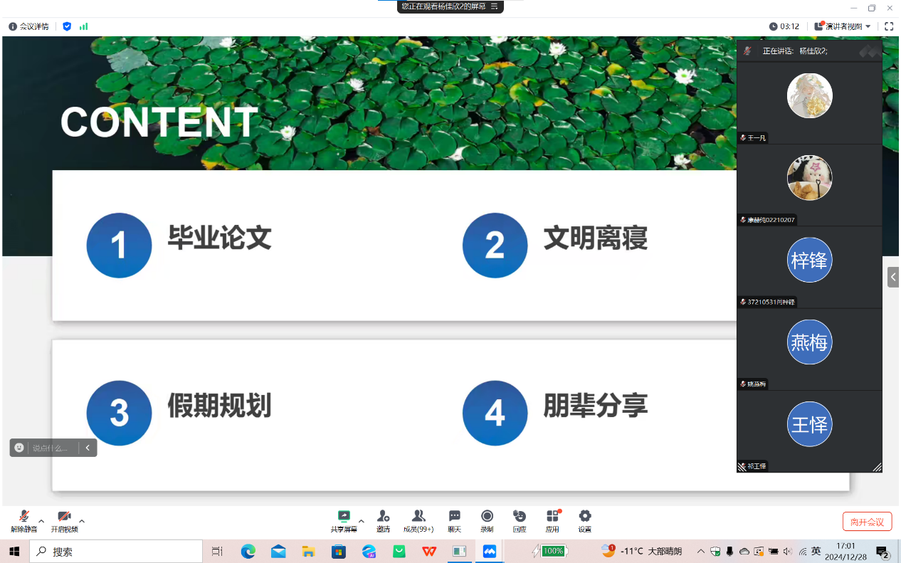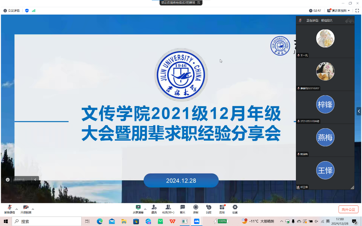 暨新闻与传播学院在寒假前夕以线上形式召开了年级大会暨朋辈就业经验分享会,会议由辅导员杨佳欣老师主持,全体大四学生参加了此次大会。会议内容涵盖了毕业论文、文明离校、假期规划以及求职经验分享四个方面,为同学们即将到来的寒假生活和未来职业规划提供了宝贵的指导和建议。